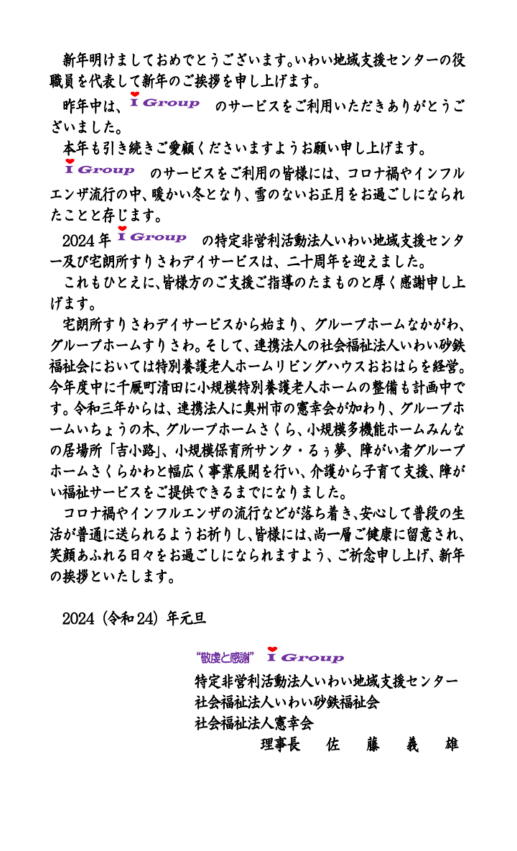へ」をミッション(使命)に「いわい地域支援センター」を立上げ、同年11月1日から宅朗所すりさわを拠点に「ケア プラン相談室」、宅朗所すりさデイサービス」、「宅朗所ホームヘルパーステーション」を開設しました。 22年には旧中川小学校で認知症対応型共同生活介護「グループホームなかがわ」を開所し、23年に「グループホームすり さわ」を開所し、地域密着型サービスの充実や認知症ケアの充実に努めて参りました。 そして、28年社会福祉法人いわい砂鉄福祉会を設立し、地域密着型小規模特別養護老人ホーム「リビングハウスおおはら 」を大原地区に開所いたしました。29年には「グループホームなかがわ」の増床を行い2ユニット体制にしました。 この間、九戸村の特定非営利活動法人くるみの家様や株式会社ホームゆりの木様、千厩町の特定非営利活動法人千厩 まちかどケアセンター様、奥州市の社会福祉法人幸生会様や北上市の社会福祉法人幸徳会様と連携し、ネットワーク化を図 って参りました。 平成28年11月株式会社ホームゆりの木が系列に入りましたが、令和2年に事業不振から閉鎖を余儀なくされてしまいました。 令和3年3月からは、奥州市の社会福祉法人憲幸会が系列に入り、提携を強めております。 特定非営利活動法人いわい地域支援センター、社会福祉法人いわい砂鉄福祉会、及び社会福祉法人憲幸会の3法人が i-Group(アイグループ)として、私たちが目指してきました。 少子高齢時代を迎え、人口減少と相まって、事業の見直しを図り、令和4年5月から憲幸会の認知症対応型通所介護(みん なの居場所「下小路」)を休止し、令和5年6月30日で廃止となりました。また、いわい地域支援センターの居宅介護支援事業所 (宅朗所いわいケアプラン相談室)令和5年5月から休業となっております。 現在では、小規模保育事業を通して子育て支援から、デイサービス・ショートステイ・認知症対応型グループホーム、小規模 多機能居宅介護事業、特別養護老人ホームを中心とした介護事業、そして障がい者福祉サービスのご提供と在宅サービスから 施設サービスまで、子どもから高齢者までサービスがご提供できる地域包括支援システムの一翼を担えるようになり、共生社会の 実現に邁進しております。 特定非営利活動法人いわい地域支援センターの10周年記念で打ち出した「Next 10」(これからの10年)プランは、着実の 進捗し、その成果を出しております。 これもひとえに、地域の皆様方からのご支援とご指導の賜物と厚く感謝申し上げます。敬虔と感謝の心を常に持ち、「あなたの “・・・したい”を応援」して参ります。 私たちは、小規模法人が手を取り合い、ホールディングス化を図ることで、スケールメリットを活かし、情報の集積化やコストダ ウン、人材育成などができるものと考えています。 今後とも、皆様のご指導ご鞭撻を賜りますようお願い申し上げます。 2023(令和5)年11月 ![]() 特定非営利活動法人いわい地域支援センター 社会福祉法人いわい砂鉄福祉会 社会福祉法人憲幸会 理事長 佐藤義雄 (プロフィール)編集中!