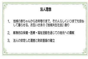 平成9年より社会福祉法人全人会として運営しておりました当法人ですが、平成26年度より法人名も憲幸会(けんこうかい)と改め、新体制で心機一転、新たなスタートを切りました。 新しい法人名は、奥州市の医療福祉の発展を願い、法人に対しても多大な貢献をしてくださった「岩淵憲次郎先生」の一字を頂き、佐倉河のこの地で憲次郎先生の思いを実現し、地域の皆様の「幸せ」のために当法人がお役に立てるようにとの思いを込めて名付けられました。 「憲幸」は「健康」にもつながる言葉でもあり、皆様が願う高齢者の健康、地域の健康のお役に立てるよう、職員一同新たな気持ちで頑張っております。多くの皆様に、社会福祉法人憲幸会のことを知っていただき、当法人の活動にご理解、ご協力をいただけますよう、お願い申し上げます。 |